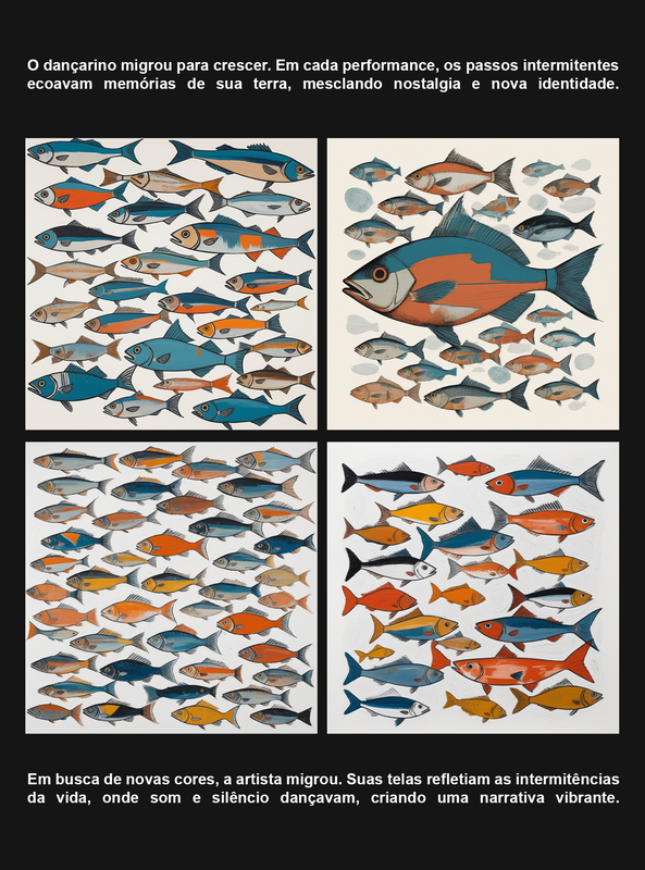 A coleção apresentada mostra a criação de uma sociedade de peixes (antropomorfizados) que, no oceano, entram em migração por motivos alheios à compreensão de nossa sociedade, em etapas migratórias. Utilizamos de ferramentas de IA text-to-image para desenvolvimento dos movimentos migratórios de 6 espécies de peixes diferentes (sendo estas: Sargo-de-dente; Carpa Cruciana; Achigã; Salmo-labrax; Baiacu; Salmão-rei) através do qual, retratados baseados em movimentos artísticos e pintores reconhecidos globalmente, apresentam histórias diferentes em seu processos de deslocamento no mar. A história de cada obra é completada seguindo o tema proposto a cada migração e a poética proposta pelos artistas, utilizando-se de IA text-to-text para sua redação. Os temas são: memórias das artes; vida; crises; questões emergentes e o estado da arte; realidades múltiplas e realidades lúdicas; transcendência. Utilizando-se de tecnologias diversas de IA para representar artisticamente o processo migratório virtual de animais da vida marinha os artistas propõe uma discussão frente a vida, movimentação, agilidade e transformação constante a qual não somente o campo artístico passa mas com o qual dialogamos diariamente direta ou indiretamente com a natureza e o ambiente a nossa volta, o foco aqui sendo o mar.